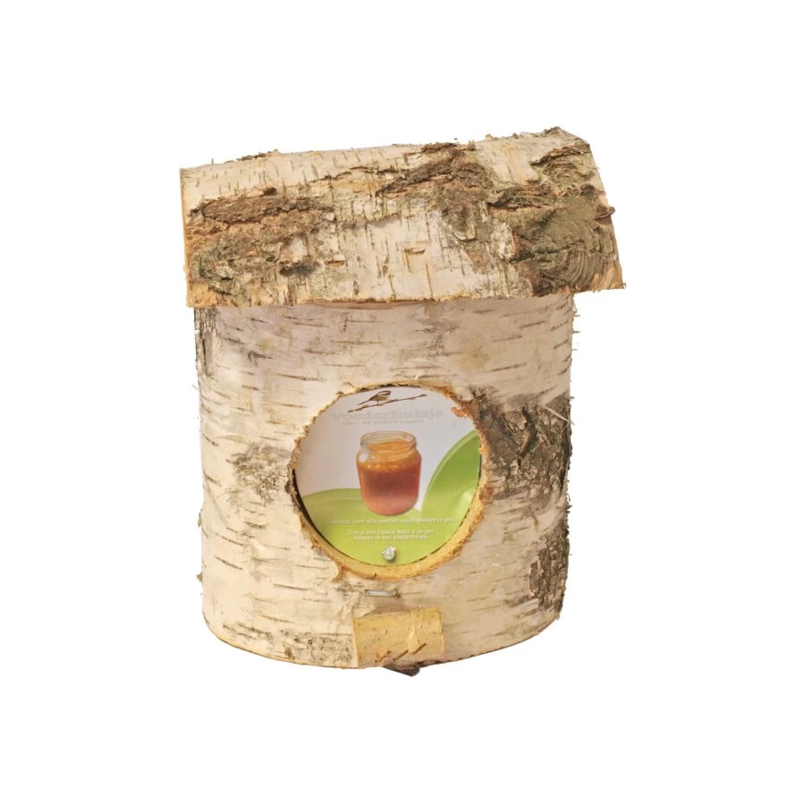 Pindakaaspot houder berken met berken dak. Een pot vogelpindakaas voor buitenvogels kan u heel gemakkelijk ophangen met deze berken pindakaaspothouder. Deze pindakaaspothouder is verkrijgbaar met een berken, tenen of stro dak. Hang de pindakaaspothouder aan een muur, boom of schutting en schuif een pot pindakaas voor vogels (zonder deksel) in de berken houder. Zo creëert u een drukbezochte voederplaats voor veel kleurrijke buitenvogels.