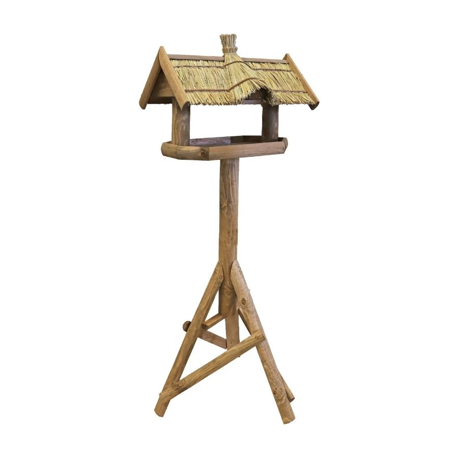 Voederhuis bruin met stro stulpdak op poot is een gezellig en duurzaam voederhuis voor vele soorten buitenvogels. Het voederhuis is makkelijk te verplaatsen en is gemaakt van vurenhout en is afgewerkt met een stro stulpdak. Het hout is geïmpregneerd in een bad, waardoor dit huisje het gehele jaar gebruikt kan worden. Zo zullen diverse soorten buitenvogels uw tuin bezoeken, die u op hun beurt laten genieten van hun aanwezigheid en bedrijvigheid. – Afmeting : 135,0 x 53,0 x 48,0 cm – Gewicht : 7,6kg