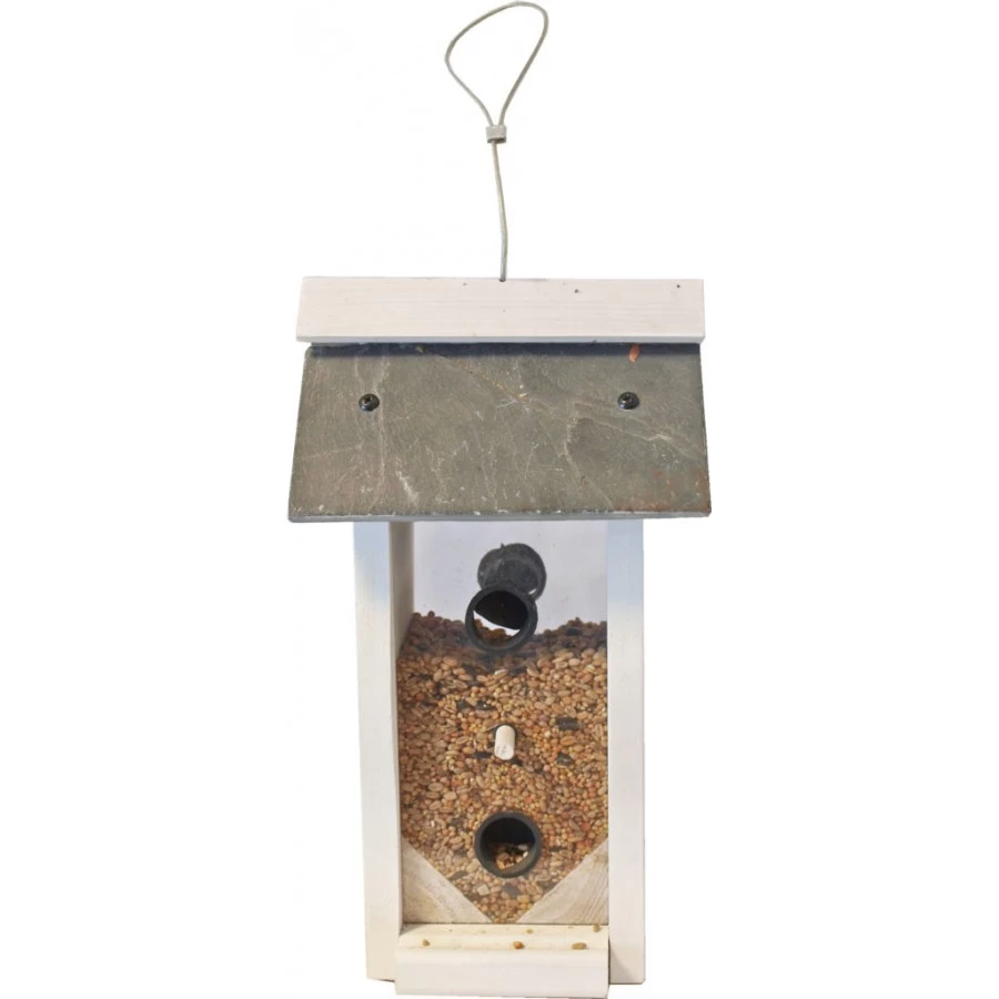 Voedersilo wit/leisteen ophangbaar 29 cm met puntdak is een mooie voedersilo die voor een mooie aankleding van uw tuin zorgt. Deze voedersilo is wit met een puntdak afgewerkt met leisteen en op te hangen aan een metalen lus. Het is een ideale voederplek voor (kleine) vogels.