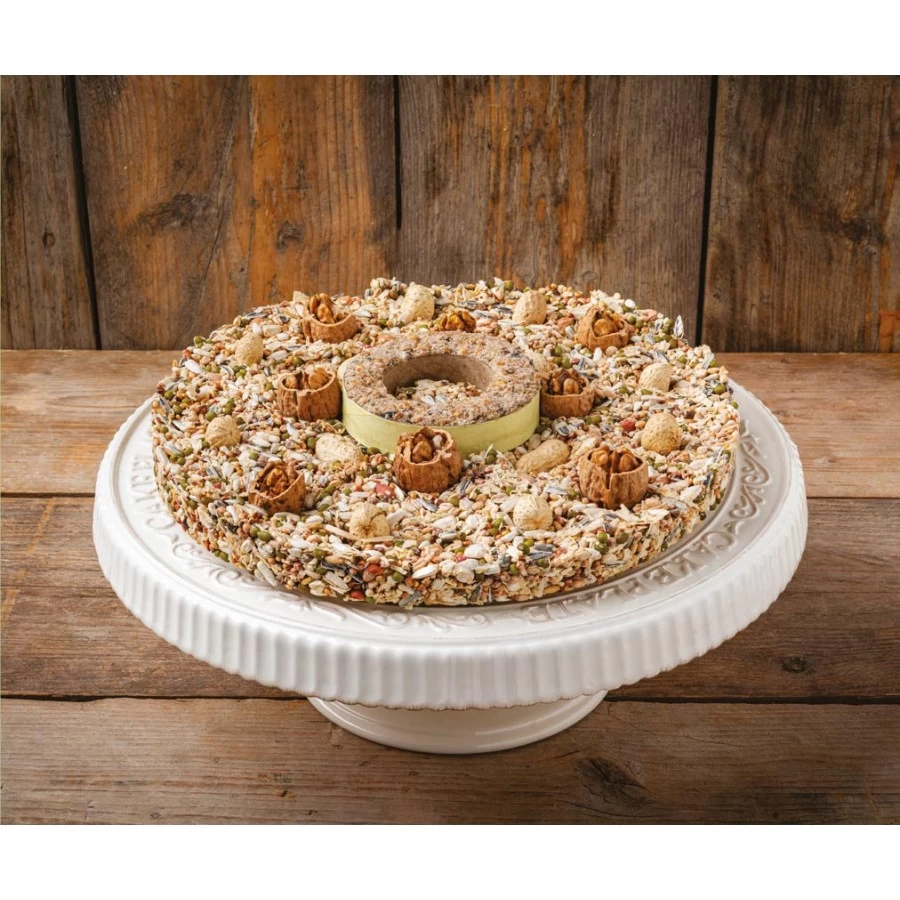 Heerlijke vogelvoedertaart voor de buitenvogels met vetring. Gemaakt van heerlijk granen, zaden en andere gezonde ingrediënten. presenteer deze taart op een voedertafel of gewooon op uw tuintafel, eventueel met een taartplateau er onder, voor een feestelijk maal voor uw tuinvogels. Vogelvoedertaart vetring is een aanvullend diervoeder voor buitenvogels. Inhoud: 800 gram. Gebruiksaanwijzing: leg de vogelvoedertaart op een open en rustige plek, toegankelijk voor buitenvogels. Samenstelling: vetring, doppindas, walnoten, gepelde pinda’s, zonnebloempitten wit, zonnebloempitten gestreept, kardizaad, katjang idjoe, zaagsel, gelatinepoeder en glucosestroop. Analytische bestanddelen: ruw eiwit 21,30%, ruw vet 29,90%, ruwe celstof 12,90%, ruwe as 2,02%. Koel en droog bewaren.