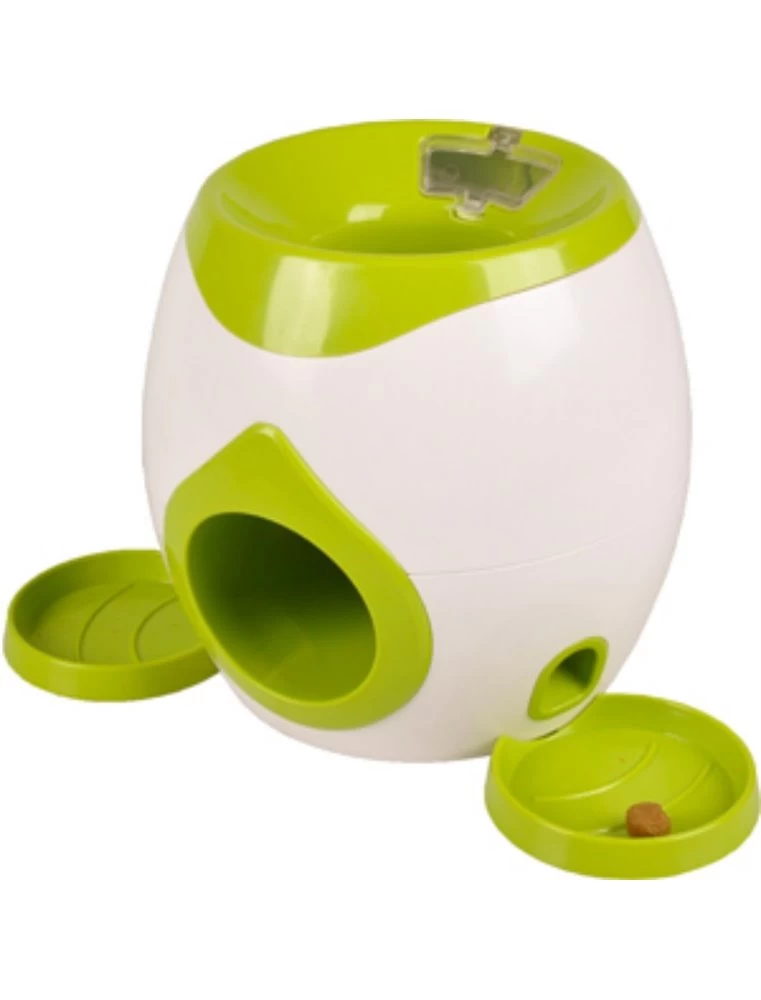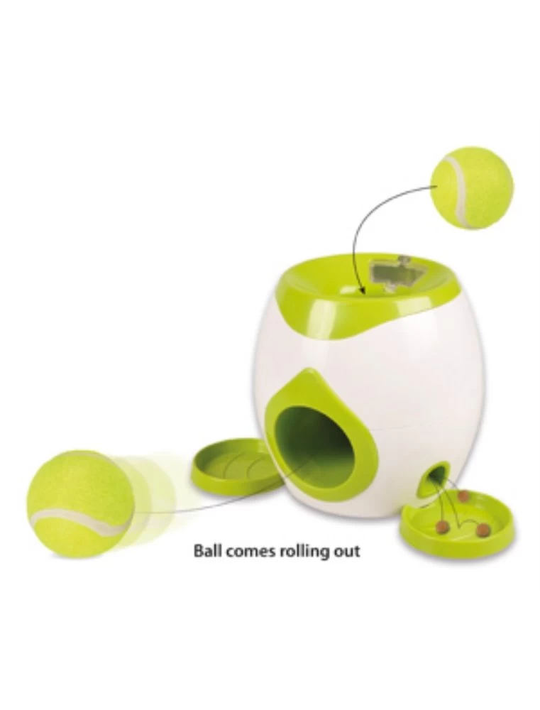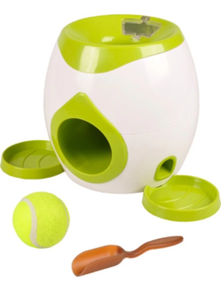De Wilson van FLAMINGO is een slim interactief hondenspeeltje dat je hond beloont met traktaties! Het speelgoed is geschikt voor brokken en beloningen met een maximale diameter van 12,5 mm. Wanneer je hond de bal terug in de voedseldispenser plaatst, wordt hij onmiddellijk beloond met een traktatie. Het Wilson interactieve apporteer- en trakteerspeeltje van FLAMINGO heeft geen batterijen nodig. Een tennisbal en een schepje zijn bij de levering inbegrepen.