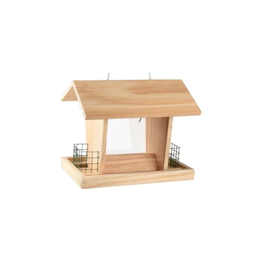 Met metalen ophangdraad om eenvoudig op te hangen. Met behandeld hout. In de bodem zitten drainagegaatjes om water af te voeren. 2 in 1: geschikt om te vullen met zowel zaden als vetblokken. Met verdeelblokje om de zaden gelijkmatig te verdelen.